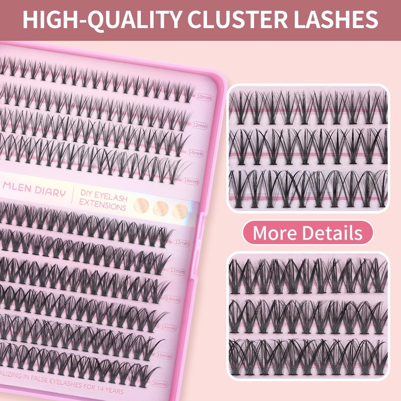 MLEN DIARY Individual Lashes Lash Cluster DIY Eyelash Extensions 200 Clusters Lashes 10-16mm D Curl Mega Wispy Volume Individual Lashes Eyelash Clusters Extensions DIY at Home
