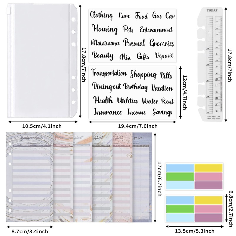 - What's included in your envelope budget system : 1pcs premium PU leather 6 ring A6 budget binder with elastic band, 8pcs money saving envelopes, 12pcs budget sheets , 2pcs English stickers ,2pcs colorful stickers and 1 pcs ruler . This cash organizer system, money organizer for cash is a great way to organize and manage your money. It can manage cash expenses and money saving.