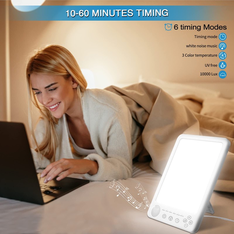 - Upgraded SAD light : Upgraded design included white noise music, smart touch button , wake-up function and hanging hole of backside .There are 15 white noise music ,it can adjust your mood and improve your sleeping ; the SAD lamp featured very sensitive touch control, you can effortlessly control all the functions of the light therapy lamp at your fingertips; It built-in wake-up function has 6, 7, 8, 9,10,12 hour set.