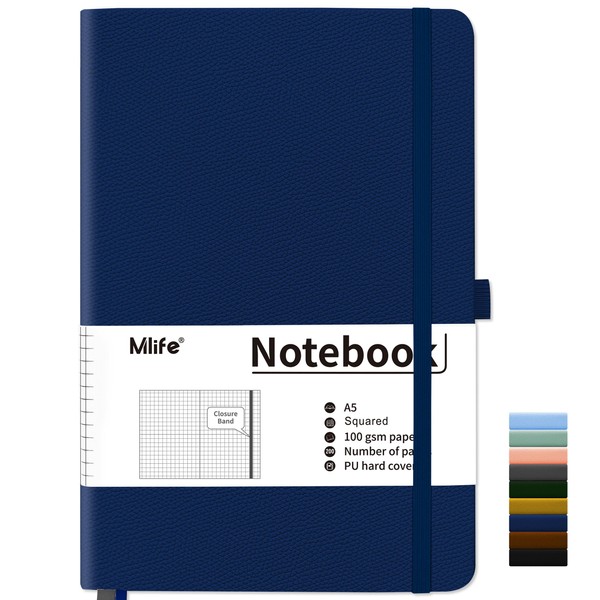 Mlife Squared Notebook A5,Journal Notebooks With 200 Pages,100gsm No Bleed Grid Notebook Pages,PU Hard Cover,Graph Paper Notebook for Graphing Notes Math,Notepad for Women Men School Office- Blue
