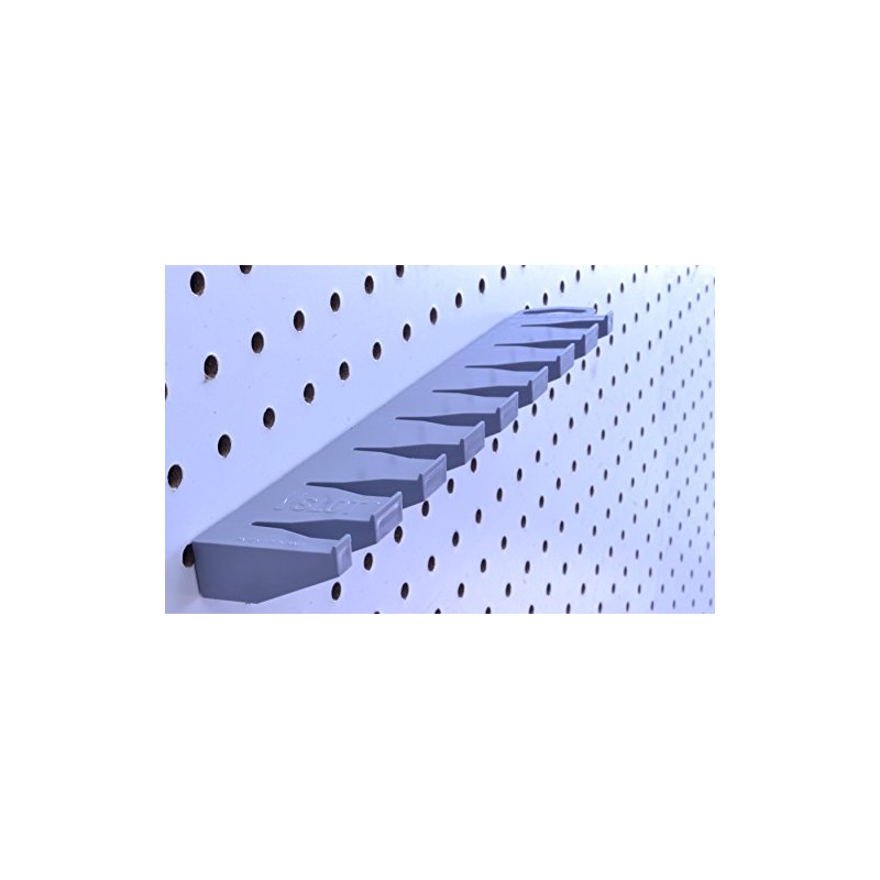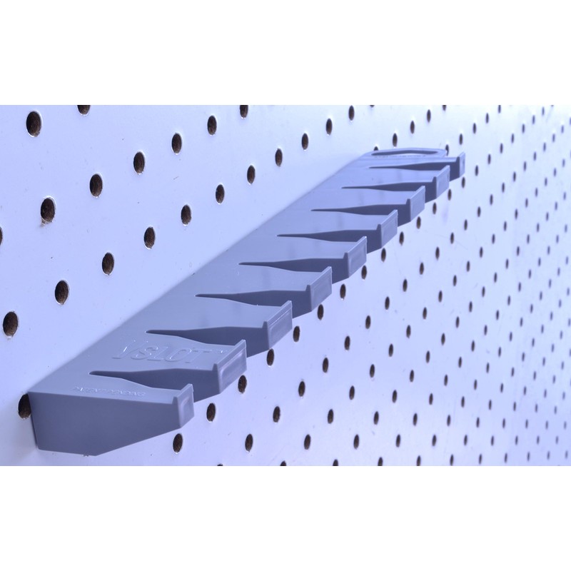 Perfect screwdriver storage! Organize your garage or workspace with the V-Slot Screwdriver organizer. Designed for use on all common pegboard sizes. The Patent Pending “V” Slot securely holds a wide variety of tools. Tools tilt slightly for added stability on the wall. Available in gray. Made in USA