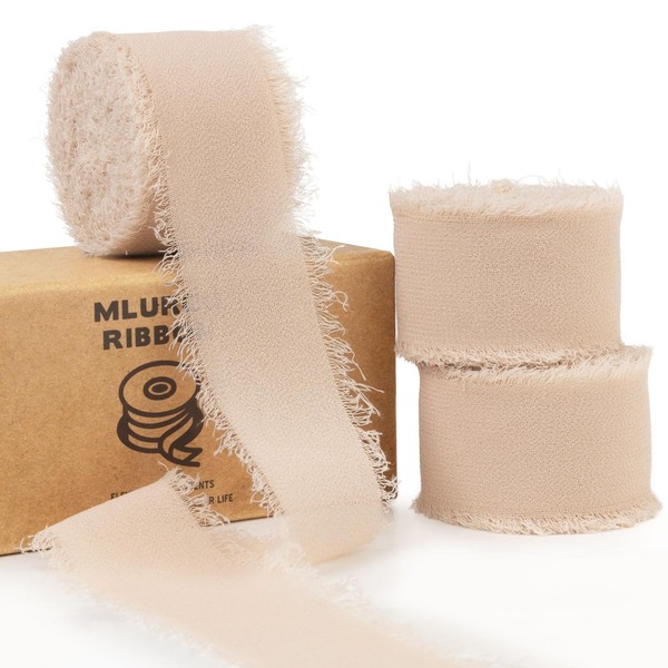 Mlurcu Beige Chiffon Ribbon - 1 Inch x 21 Yards Boho Frayed Fringe Chiffon Silk Ribbon for Gift Wrapping, Wedding Invitation, Bridal Flower Bouquets
