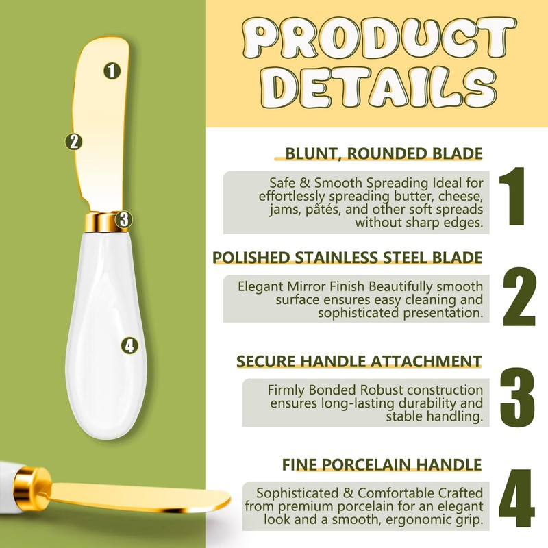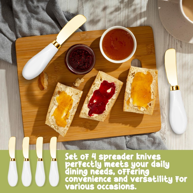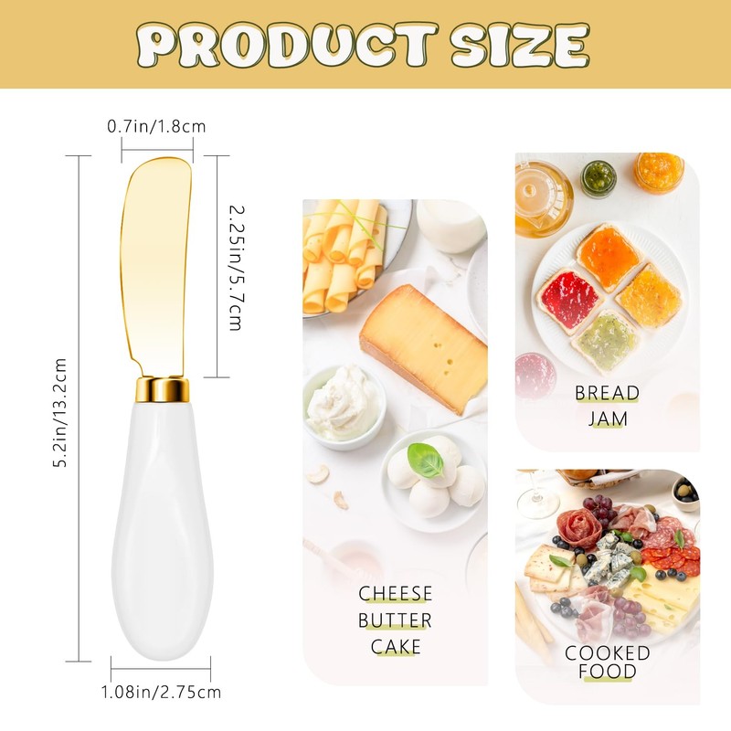 - 【Durable and Reusable Spreader Knives】Made from durable stainless steel with sophisticated porcelain handles, these butter spreader knives are built to last. Easy to clean and reusable, they are a practical, economical choice for your kitchen. Ideal for enhancing your charcuterie boards and dining presentation.