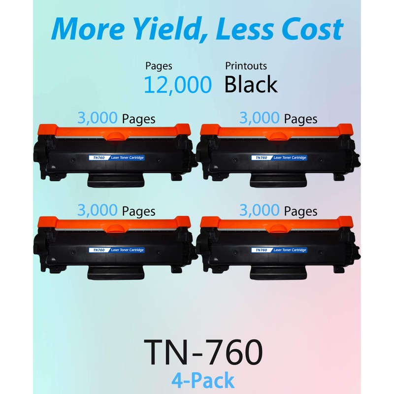 - Package Contents: 4-Pack TN-760 TN760 Printer Toner Cartridge (With Chip, 4x Black)