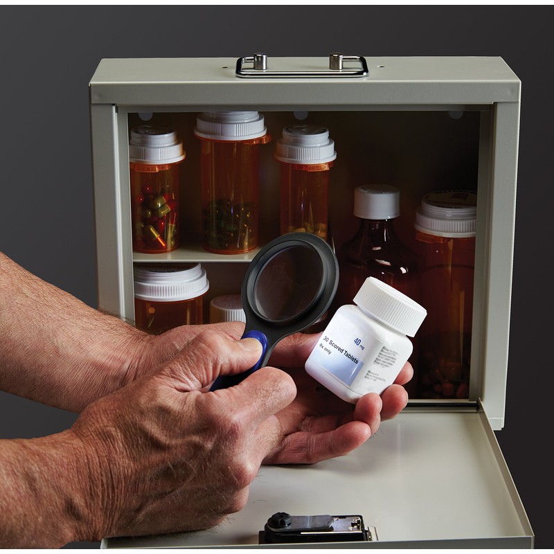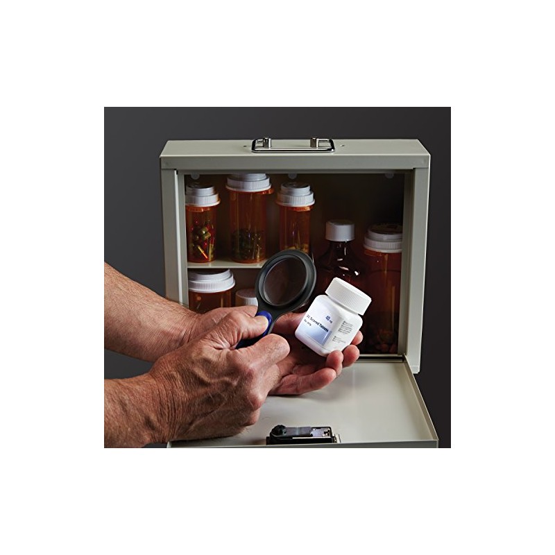 - Includes two interior shelves with space for oversized bottles, a top-rack dishwasher safe pill sorting tray, and a LED illuminated 10x magnifier