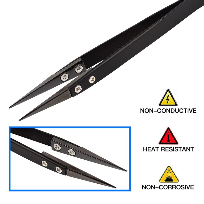 - Heat Resistant Black Carbon Fiber Handle for comfortable Secure grip. These Tweezers will not rust, corrode, or tarnish. They are resistant to most acids and can be used with cleaning solutions and many other chemicals. These tweezers are Anti-magnetic