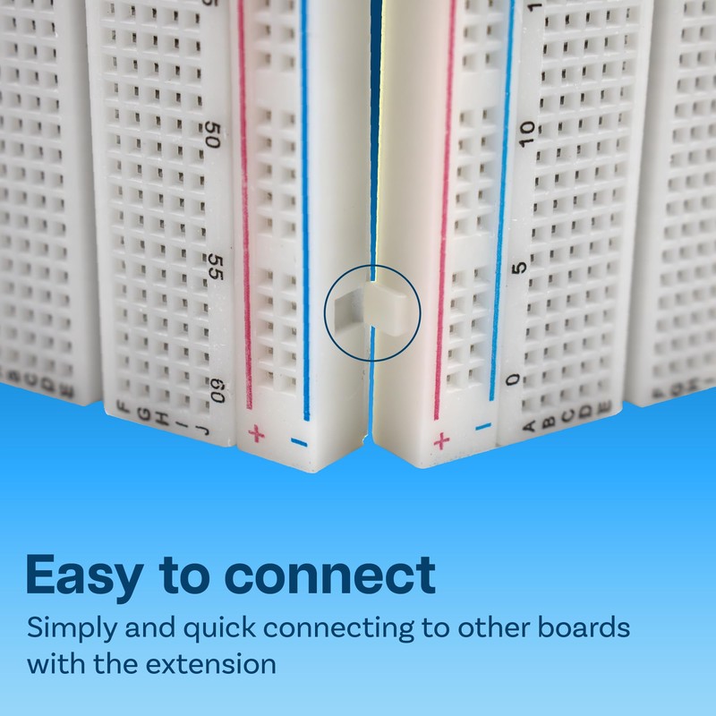 The breadboard consists of a housing made of white ABS plastic with black lettering, including coloured lettering on the distribution strips. The solderless breadboard comes with self-adhesive adhesive strips on the back, making it easy to attach to any surface. The contact points are marked both horizontally and vertically.