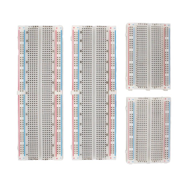 This solderless breadboard kit has 2 x 830 contacts and 2 x 400 contacts for quick assembly of electronic circuits. The 830 point prototype PCB breadboard has dimensions of 16.5 x 5.5 x 1 cm (6.5 x 2.17 x 0.39 inches), and the 400 point breadboard has dimensions of 8.2 x 5.5 x 1 cm (3.23 x 2.17 x 0.39 inches).