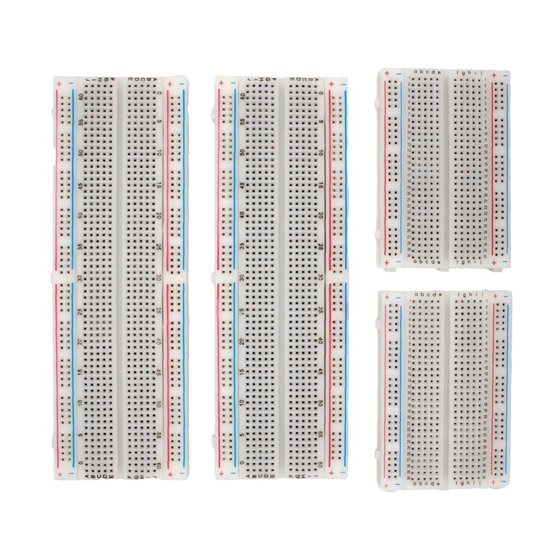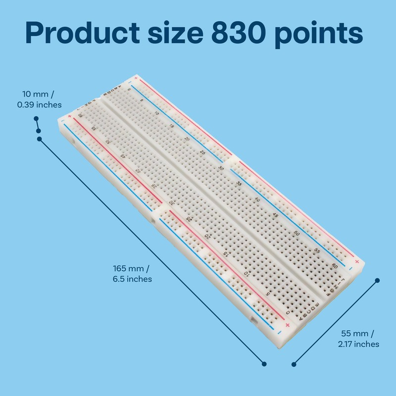• Size - This solderless breadboard kit has 2 x 830 contacts and 2 x 400 contacts for quick assembly of electronic circuits. The 830 point prototype PCB breadboard has dimensions of 16.5 x 5.5 x 1 cm (6.5 x 2.17 x 0.39 inches), and the 400 point breadboard has dimensions of 8.2 x 5.5 x 1 cm (3.23 x 2.17 x 0.39 inches).