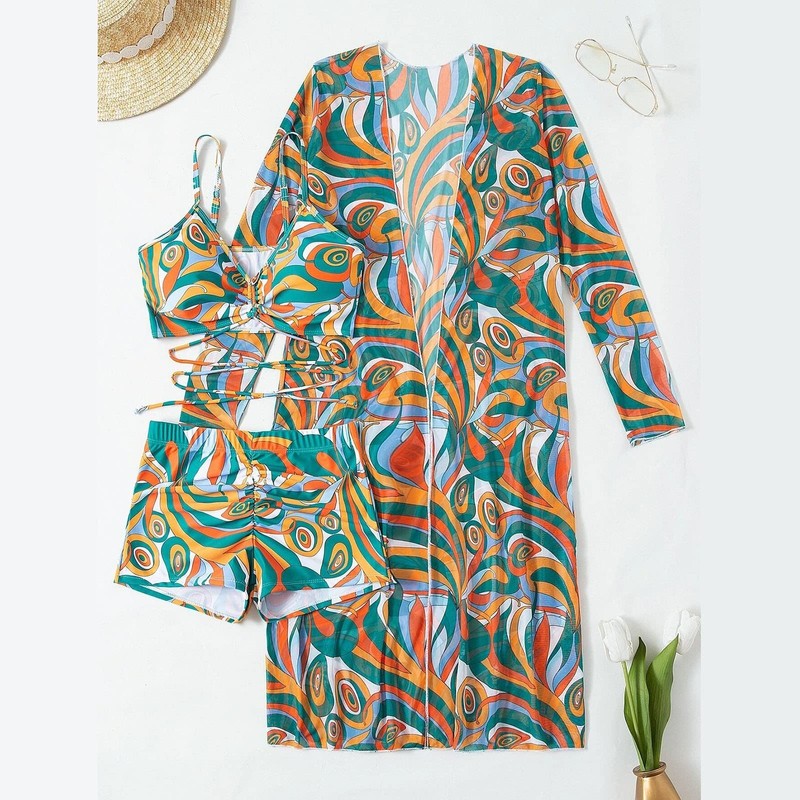 MMOOVV Bikinis mit hoher Taille 3-teiliger Bikini Set vertuschen Badeanzug für Frauen Langarm-Push-Up-Badebekleidung Beachwear Badeanzug (D, S)