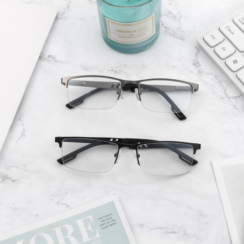 MMOWW 2 Pack Metal Half Frame Reading Glasses for Men Aluminum Magnesium Arms Spring Hinges, Black/Gunmetal +2.5