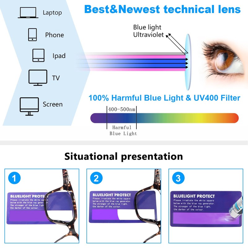 - Blue Light Blocking: The lens can filter harmful blue light, effectively reduce the harmful blue light damage to the eyes when using electronic devices for a long time, relieve eye fatigue and protect the health of eyesight