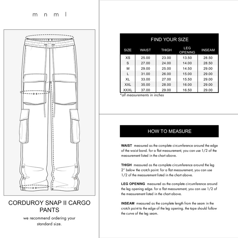 • Corduroy Snap II Cargo Pants are designed with cargo pockets located on the front thigh and side seam, an elastic waistband with elastic drawcord, and finished off with a snap enclosure at the outseam.
