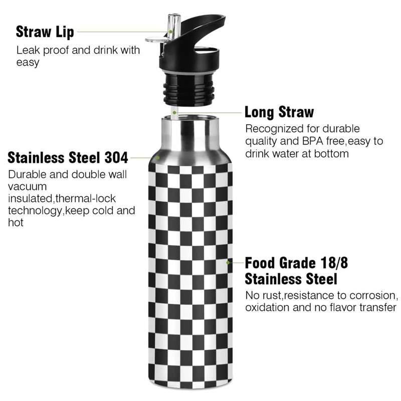 Mnsruu Black White Checkered Pattern Water Bottle for Girls Boys Stainless Steel Drink Flask Straw Vacuum Insulated Leakproof Thermos for Sports 600 ml