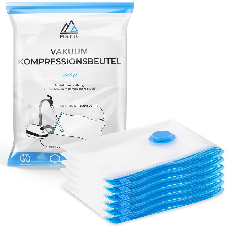 MNT10 vacuum bag The bags are available in four sizes - S, M, L and XL. Depending on the set, different sizes are combined - you have the choice! You can store different textiles (bedding, clothing) and be prepared for any situation. While other vacuum bags often tear or leak quickly, our MNT10 vacuum bags are made from a very durable plastic and have extra-wide welded seams. The double seal of the closure makes the storage bags particularly airtight. Whether you are travelling or storing clothes – you can compress your clothes, duvets or bed linen to a much smaller size in no time at all and save valuable space. Our practical vacuum bags not only save space, but also protect your clothes from odour, dust, moisture or bugs.
