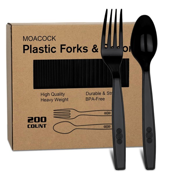 MOACOCK MOACOCK 200 Count Plastic Silverware, Heavy Weight Plastic Forks Spoons, Disposable Utensils Cutlery Set for Wedding Party Supplies Everyday Use