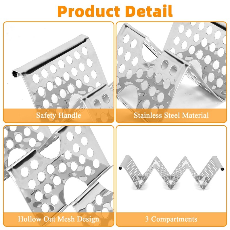 - 【User-Friendly Design】The taco tray holder features numerous small round holes on each side that allow heat to pass through quickly, ensuring your food heats up efficiently. It is safe to use in the oven and on the grill. Both sides of the taco rack are designed with edges to prevent any metal from scratching your hands. After use, the taco holders can be stacked together to save storage space.