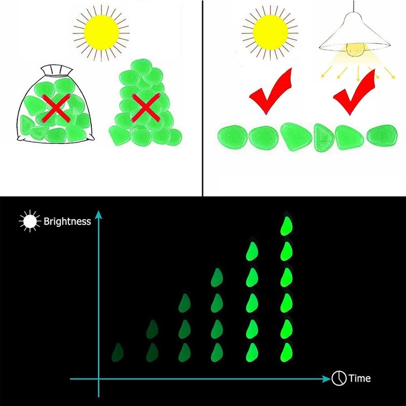- 【Glow in The Dark Pebbles】 These glowing pebbles can glow for up to 1 to 2 hours in darkness after absorbing sunlight during the day. They are going to be green glow pebble rocks at night! Please radiate them with light again if they are not bright enough.