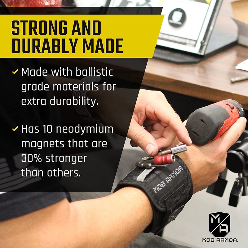 Mob Armor brings you the MAG BAND, a magnetic wristband designed to keep magnetic pieces safe and always within your reach. It features 20 super-strong neodymium magnets, two padded magnetic strips to keep screws in place, and 2 pockets for holding non-magnetic items. It can be a magnetic wristband for holding screws, a drill bit organizer, a magnetic holder for fasteners, Allen wrenches, and other small tools. It's a great gift idea for those looking for handyman gifts, dad gifts, anniversary gifts for him, tech-nerd gifts, and more. It has a one-size-fits-most feature measuring 13" x 3.25". Made with ballistic nylon material, it’s tough for long wear and tear. It has a soft lining inside for comfort and a velcro closure to keep everything in place.