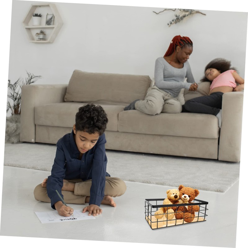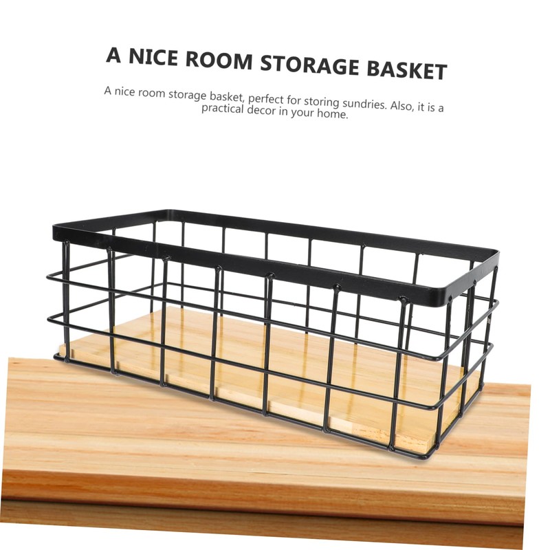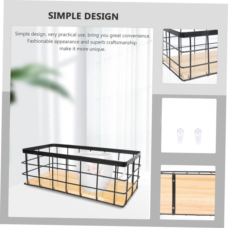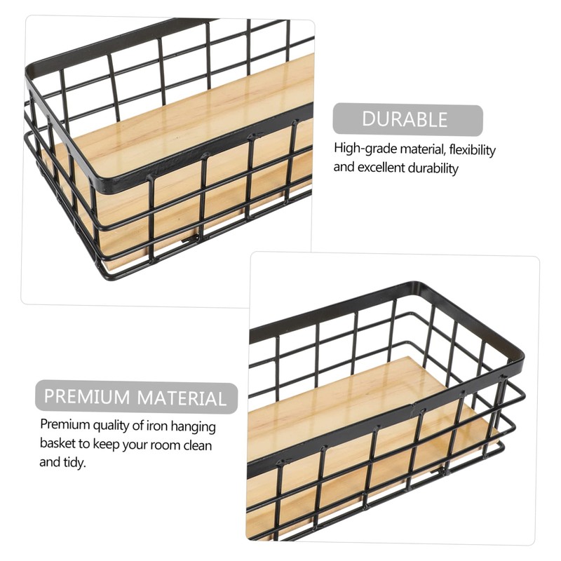 Mobestech 1Set Desktop Iron Storage Basket with Wood Board Hanging Organizer for Cosmetics Essentials Black Practical and Easy to Install for Home Office Use