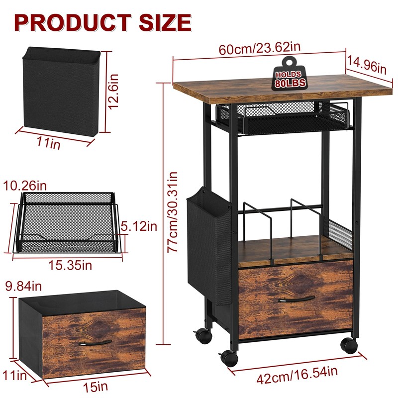 - Side Table with Storage:Maximize your workspace with this small filing cabinet, featuring a rolling printer cart for letter-size documents, dual mesh pockets for quick-grab items like pens or tools, and an open shelf for books or supplies—keeping everything from paperwork to printer ink efficiently within reach