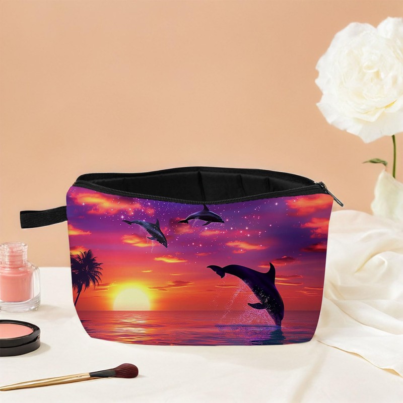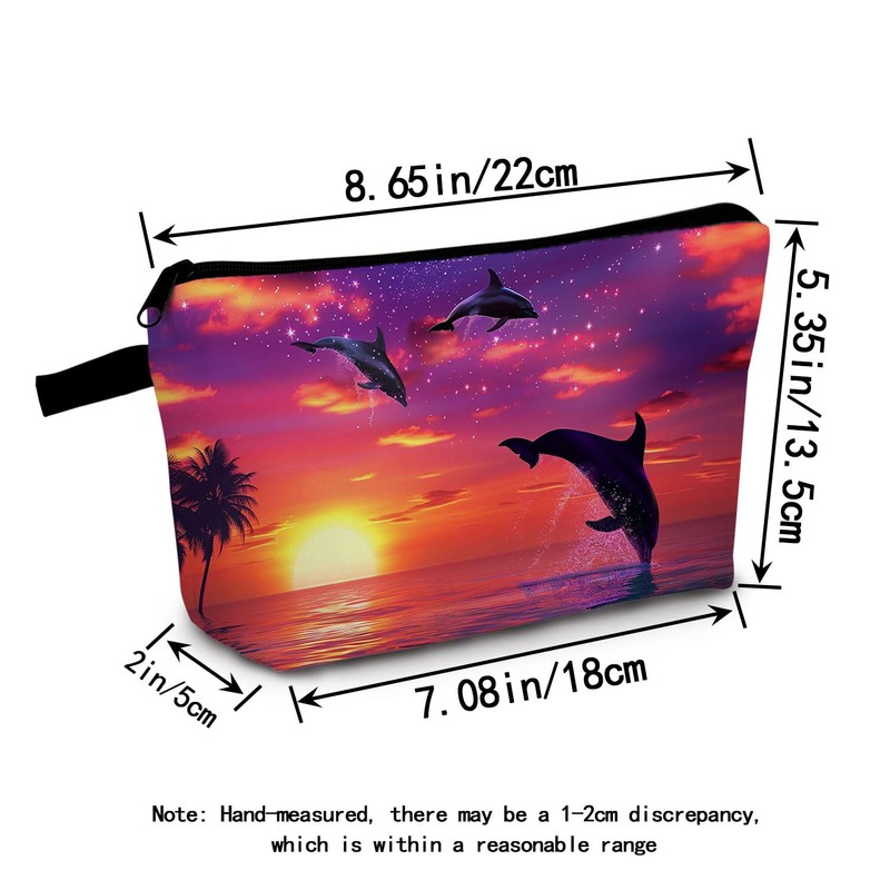 - Material: Our Dolphin printed makeup bag is crafted from polyester with a sponge-lined fabric, incorporating a thickened inner layer that offers effective cushioning and protection for cosmetics, while the surface remains comfortable and resistant to pilling.