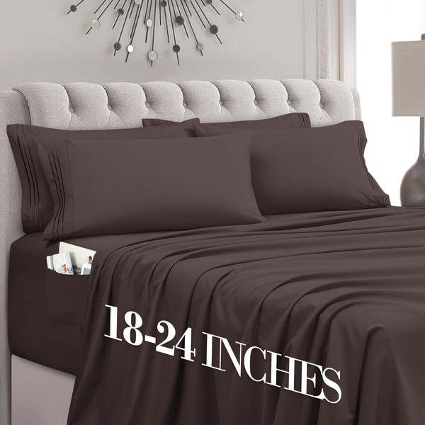 Mocassi Luxury 6-Piece Sheet Set, Ultra Soft 1800 Premium Hotel Quality Microfiber Sheet Set, Fits Mattresses Up to 18 to 24 Inches Extra Deep Pocket - Breathable and Secure Fit, King, Brown