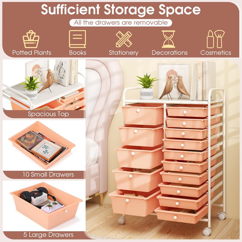 Moccha 15-Drawer Rolling Storage Cart - Under Desk Storage Drawers with wheels for Craft Art Supply Paper Salon, Scrapbook Paper Tools, Mobile Utility Cart for Classroom Teacher School Office