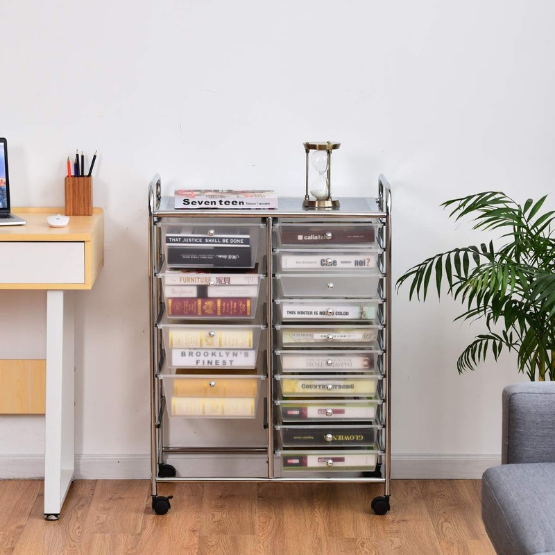 Moccha 15-Tier Drawer Storage Cart, Rolling Storage Cart with 4 Wheels, Drawer Storage Organizer, Suitable for Cosmetics, File, Office Supply, Perfect for Home and Studio (Clear)