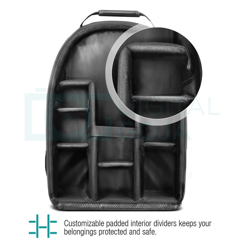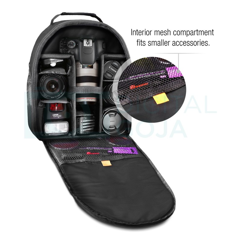- Interior de alta calidad: divisiones personalizables acolchadas y compartimentos de malla que se adaptan a todo tu equipo de fotografía, incluye un espacio para pequeños accesorios.