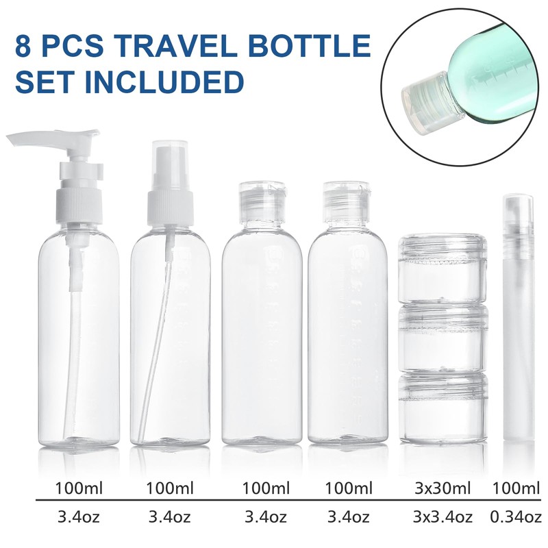 - Helpers for Travelling:The travel bottles for toiletries 100ml and airport security liquids bags can help you to carry shower gel, skin care products, etc. in separate packages. Convenient handle to carry liquid toiletries easily while waiting to go through airport security checks.