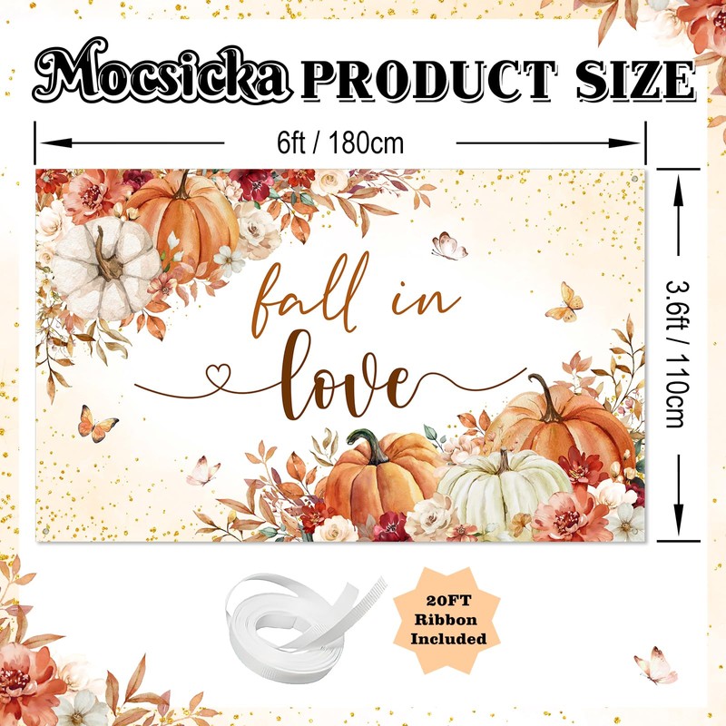 Mocsicka Fall in Love Backdrop Banner 6x3.6ft Boho Autumn Leaves Pumpkin Fall in Love Bridal Shower Party Decorations Photo Booth Props (6x3.6ft)