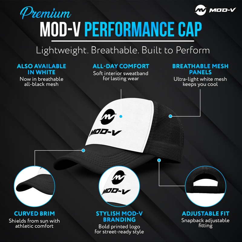 - Signature MOD-V Design: Part of the exclusive MOD-V Black and White Collection; bold, minimalist aesthetic with a crisp white front panel and jet-black mesh; structured five-panel construction ensures modern style and head-turning edge; combines streetwear appeal with everyday function for the fashion-forward individual