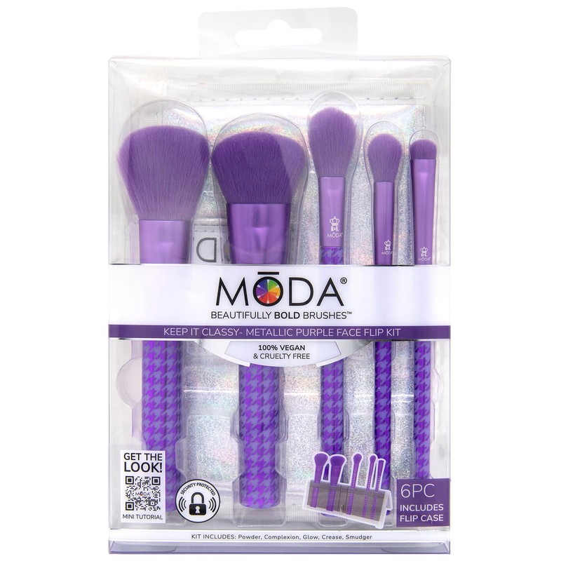 MODA Keep It Classy Face Flip Kit – 6pc Travel-Size Makeup Brush Set in Metallic Purple, Vegan & Portable