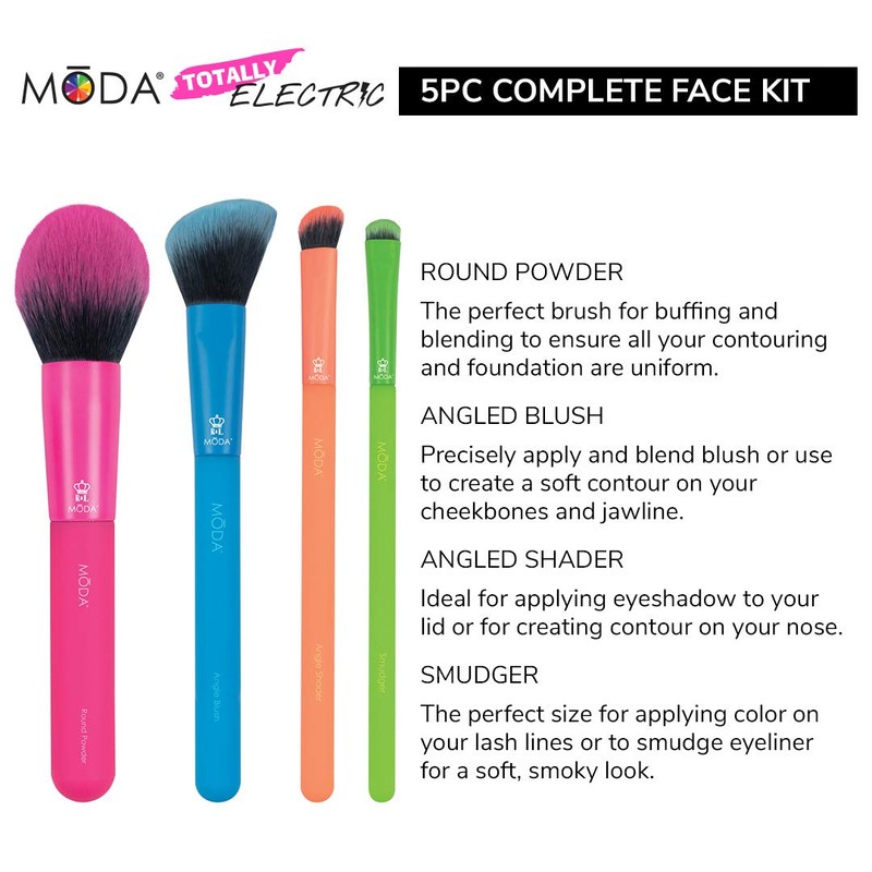 Moda Royal & Langnickel Electric Brush Set with Bag including Round Powder, Angled Blush, Angled Shading and Smudging Brush, Multi-Colour - Neon