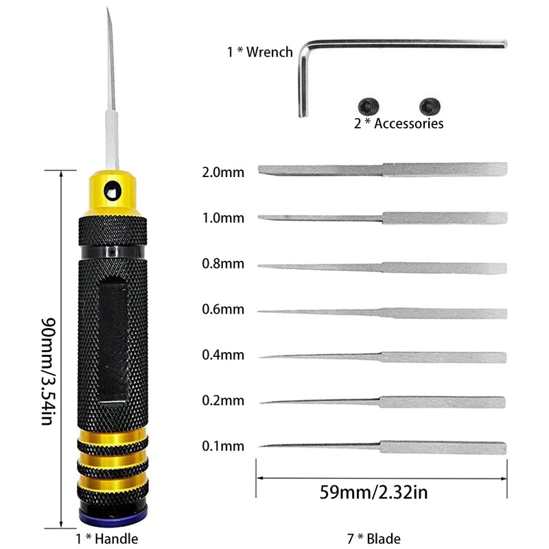 • [7 Blades Available] There are 7 blades with different sizes, including 0.1mm / 0.2mm / 0.4mm / 0.6mm / 0.8mm / 1.0mm / 2.0mm, which can meet your different working needs. You can choose the proper one to finish your project.