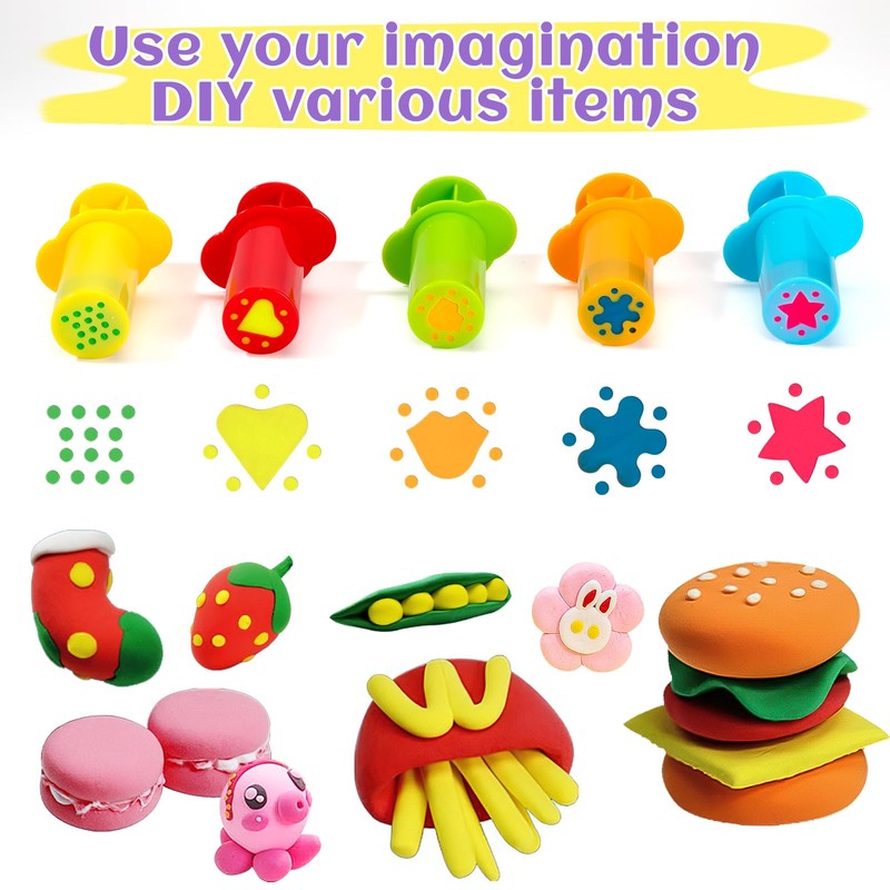 • Kneading Tools Set:25 tools including 5 x kneading machines, 12 x animal and plant shapes, 4 x rolling pin and 4 x cookie cutters for different creative needs.