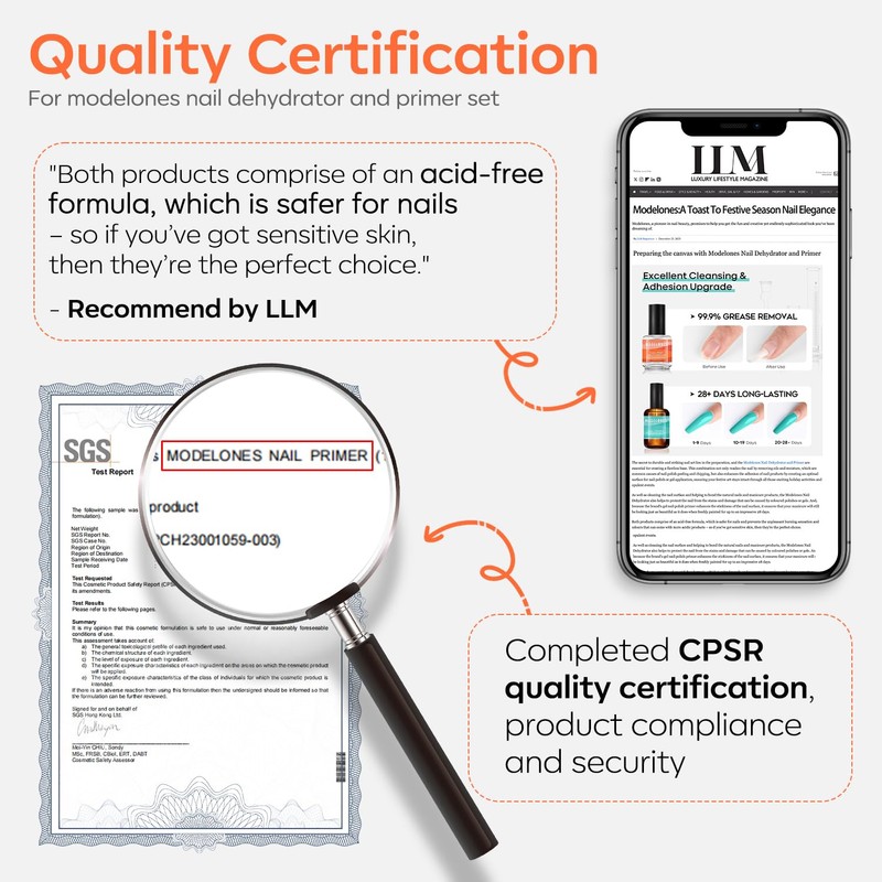 - The basis and must-have of nail art: To create a foundation, using this nail prep kit to prepare the nail plate is the most crucial step in any professional manicure! The dehydrator nail prep can clean the nail surface and helps to bond the natural nails and mani products. The gel nail polish primer can enhance the stickiness of the nail surface, and help the mani products not lift and be long-lasting for more than 28 days