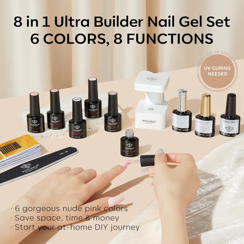Modelones Builder Gel for Gel Nails, 8 in 1 Builder Gel for Nails, Nude Pink Colours Builder Gel Set with Lamp, Top and Base Coat, UV Harder Nail Extension Gel for Nail Art, Gel Nails Do Yourself