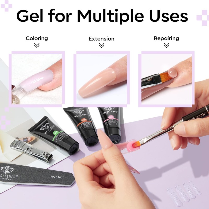 - Easy & Quickly Dry under Nail Lamp: This poly nail gel set is easy to apply. The extension gel needs to be cured under nail light. Average for light 90 secs. Even beginners can easily and quickly experience the DIY salon manicure at home through the detailed instructions on the listing and the package