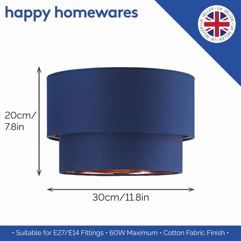 Modern and Trendy Navy Midnight Blue Cotton Fabric Double Tier Design Ceiling Pendant Lamp Shade with Shiny Copper Inner | 20cm x 30cm by Happy Homewares