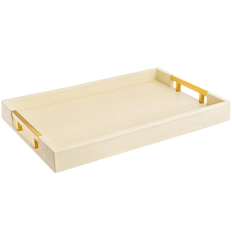 Modern Elegant 18"x12" Rectangle Cream Glossy Shagreen Decorative Ottoman Coffee Table Perfume Living Room Kitchen Serving Tray with Gold Polished Metal Handles by Home Redefined for All Occasion's
