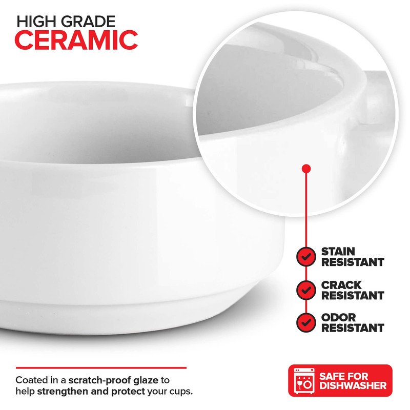 - High Grade Ceramic: Our beautiful stoneware is coated in a scratch-proof glaze to help strengthen and protect your cups. The glossy surface and chic white color makes them a perfect addition to any kitchen décor.