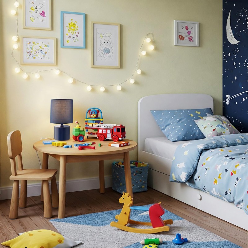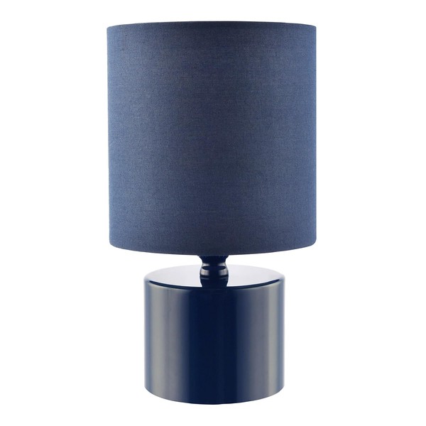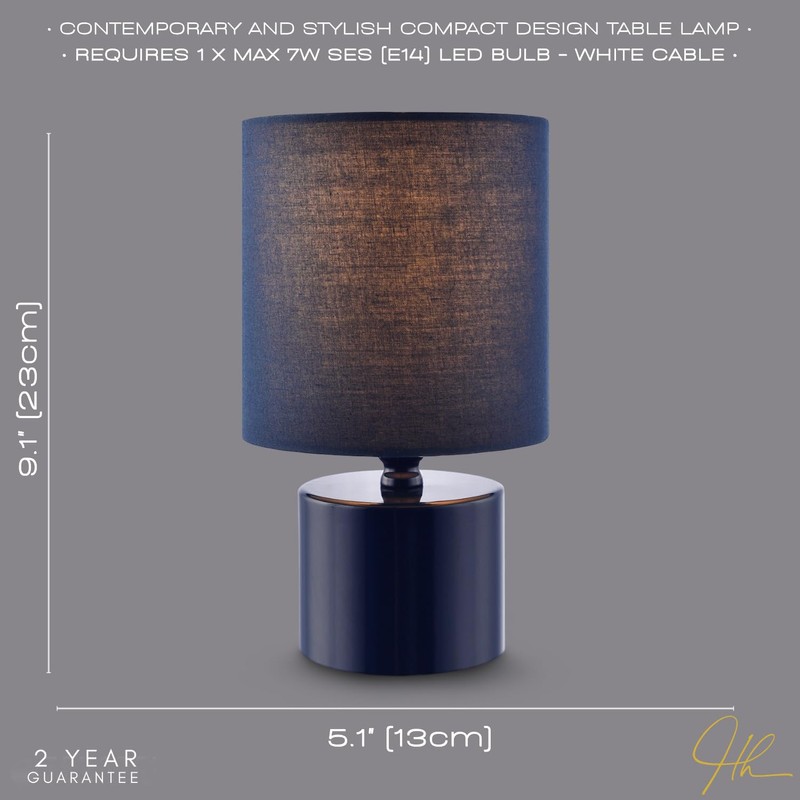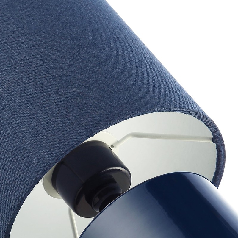 Contemporary and stylish table lamp with compact design. Makes for a perfect bedside lamp. Finished in a glossy midnight blue finish giving this item a smart and stylish look. Features on/off inline switch button located on the white cable with matching navy cotton fabric drum lamp shade. Product dimensions as follows: Height: 23cm, Width: 13cm, Depth: 13cm. Requires 1 x SES (E14) maximum 7w LED. Please note that light bulb is not included. This lamp is complete with 2-year electrical warranty.