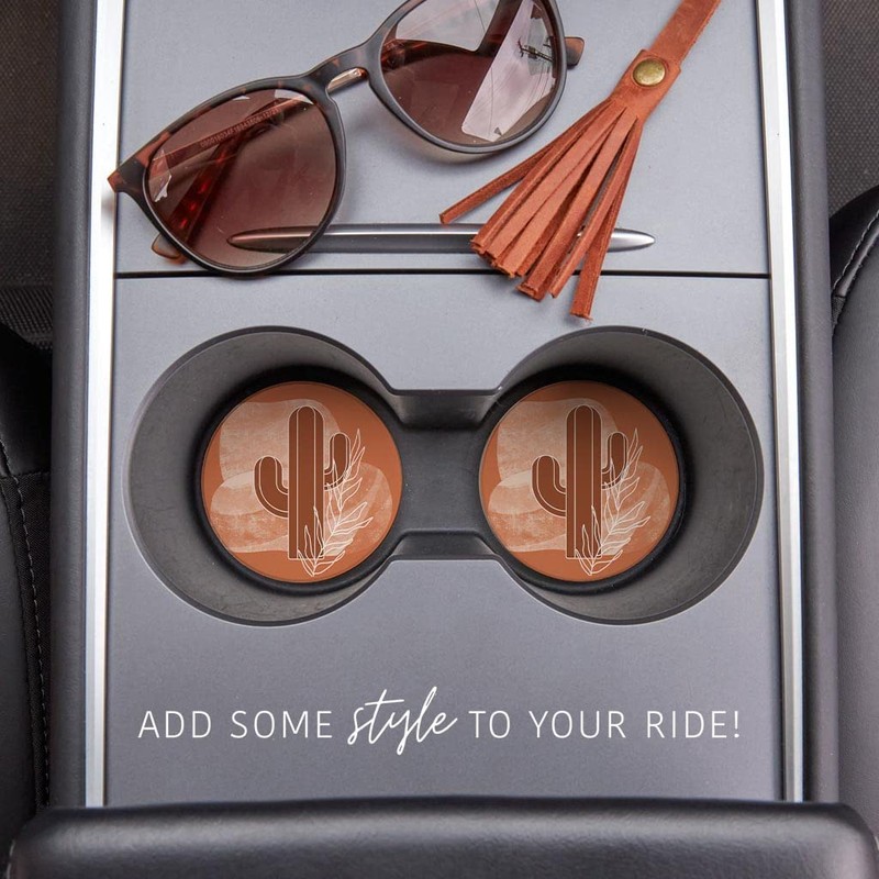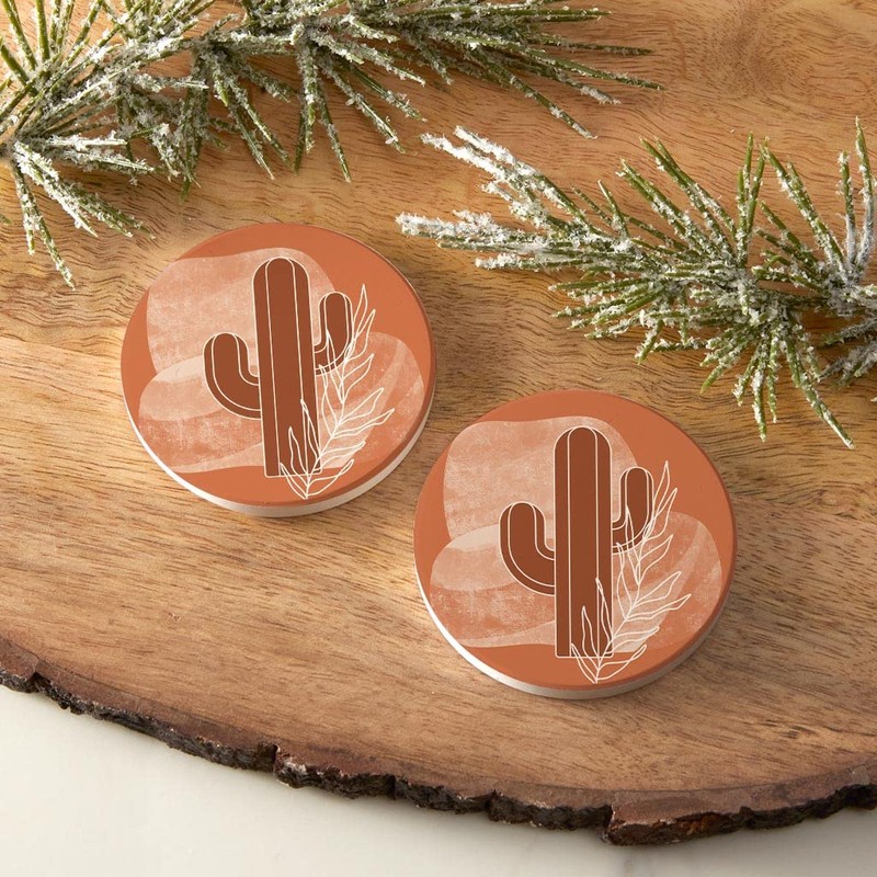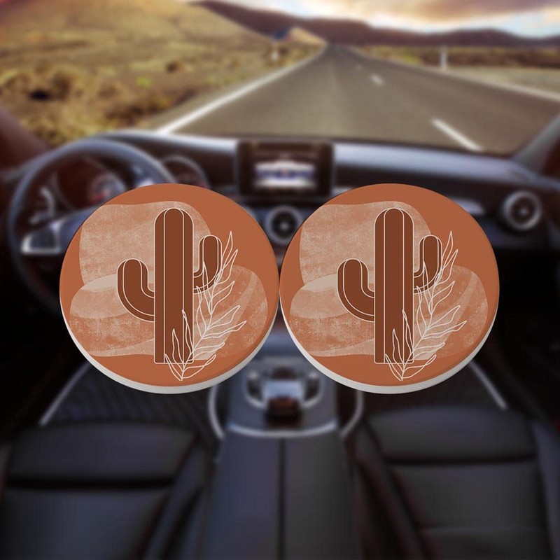 Modern Minimalist Texas Cactus, Joyride Home Decor, 2 Ceramic Car Coasters, 2.65-inch Circle Coasters, Set of 2, Vehicle Accessory, Keeps Car Cup Holder Clean, Express Your Style.