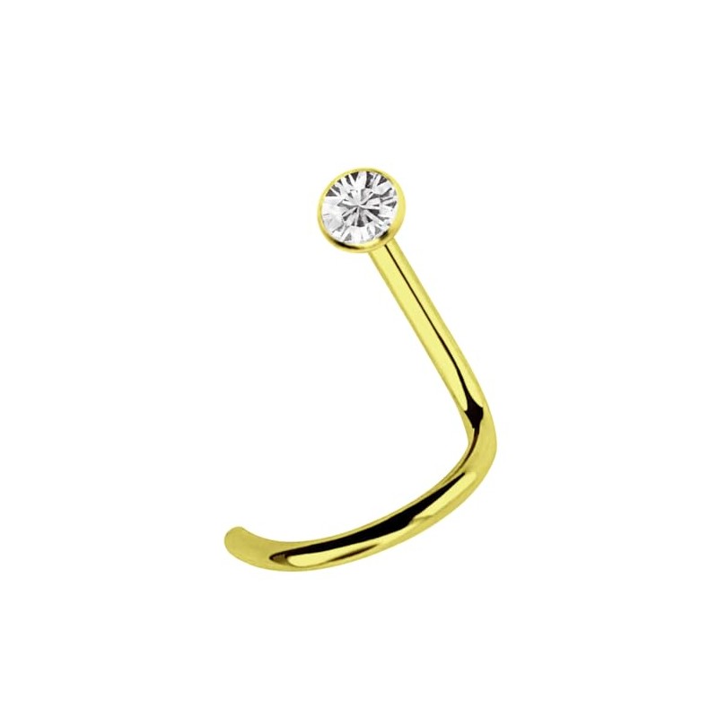 Titanium nose piercing stud with spiral and set zirconia in 2.2 mm, bar thickness 1.0 mm, bar length 7 mm (straight bridge), hard gold-plated. The stone colour is clear. Suitable as nose studs, nose length, nostril or ear piercing jewellery.