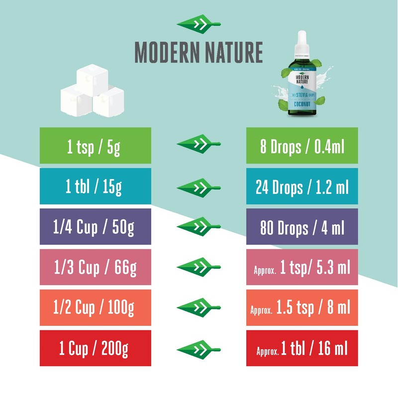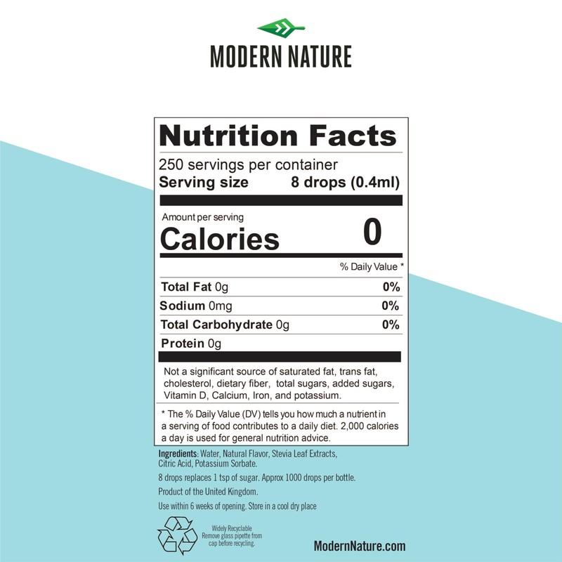 - 2000 drops per 100 ml bottle, approx. 250 servings. 8 drops correspond to 1 teaspoon of sugar
