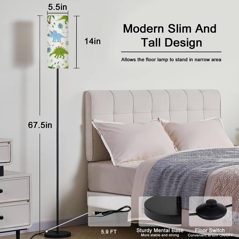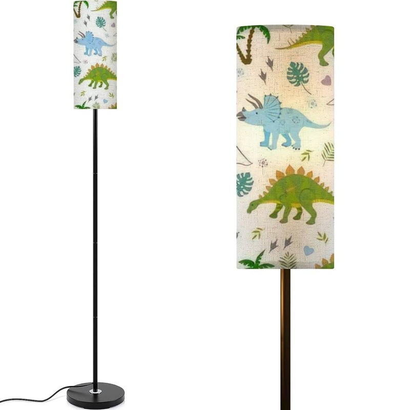 Modern seamless funny dinosaurs palms volcanoes Doodle funny animal design Floor lamp Minimalist Standing Lamps Metal Pole Lamp Tall Lamps With Linen Shade Foot Switch for Living Room Bedroom