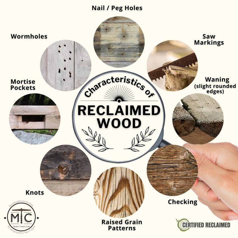 - Distinctive reclaimed features. Wood may include natural saw marks, hand hewing, knots, mortise pockets, and other signs of historical use that add character