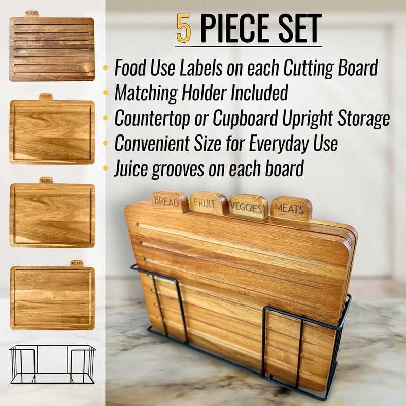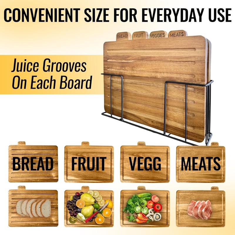 - GIVE THE PERFECT GIFT - With their unique organization features, storage rack, and solid design, this acacia cutting board set is sure to please any mom, dad, friend, home cook, chef, or culinary artist.